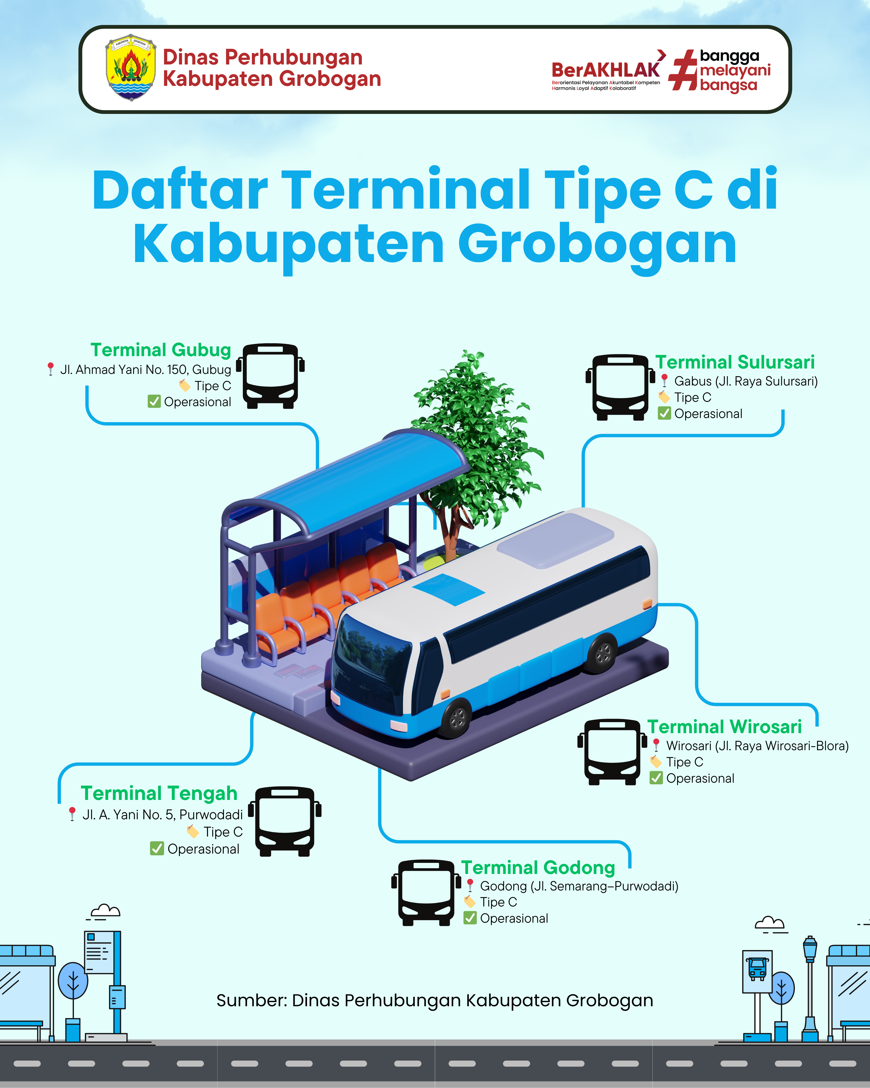 Berisikan daftar terminal beserta tipe dan alamat lengkapnya. Sampai tahun 2024, terdapat 5 terminal tipe C yang berstatus operasional di Kabupaten Grobogan.